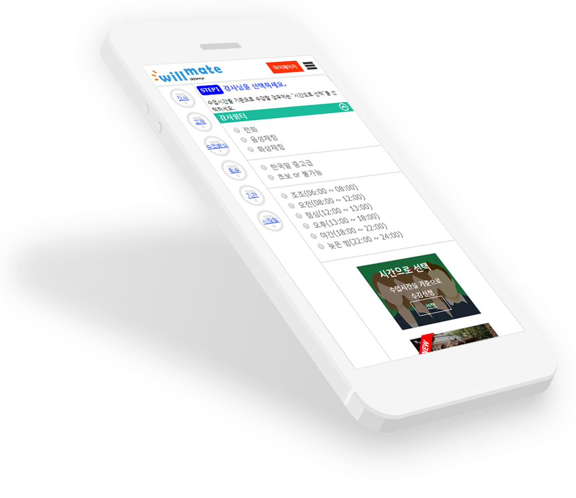 원하는 강사, 원하는 시간을 선택하셔서 윌메이트를 시작해보세요.